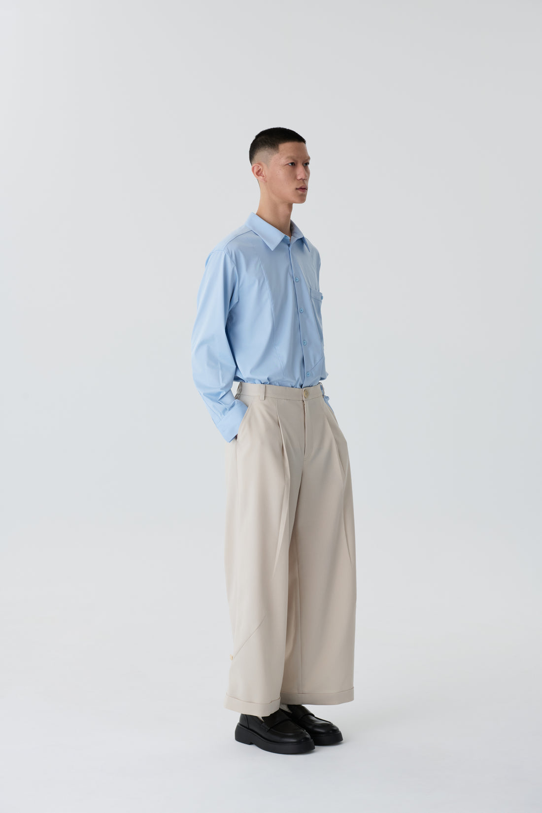 斜切飾釦寬褲
